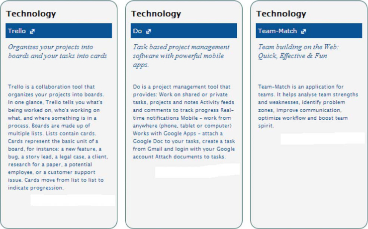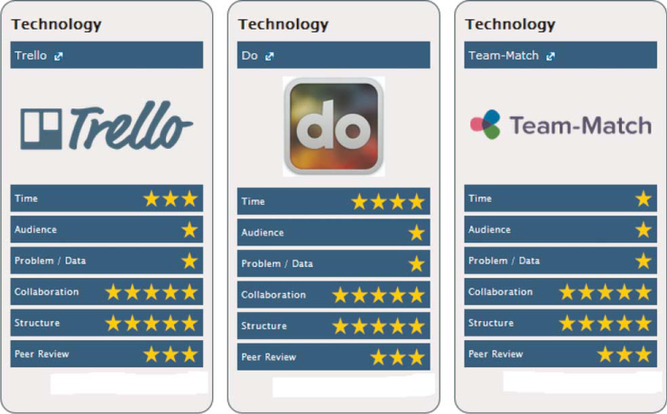Interviews with academic staff and students appeared to corroborate this conclusion. The academic lead commented that some students “adapted technologies that they were familiar with to suit this purpose”, for example two groups decided to use Facebook to organise work rather than the suggested tools. This type of innovative use of technology is predicted by the concept of interpretive flexibility, but suggests that the “top trumps” do need refining further. Crowdsourcing, that is, using student input to moderate star values over an extended period of time, is being explored as a possible long-term solution. Facebook was not considered as providing enough Structure to warrant five stars for this dimension, though does score five stars for Collaboration. The Trello software was only adopted by a small number of students, but it was deemed to be “absolutely excellent” in supporting their team working and time management, and has now been adopted by some students for all their studies. The TeamMatch software was useful in highlighting to the students their own strengths and weaknesses, though it was not used in the first iteration to form teams. No students reported using Do.