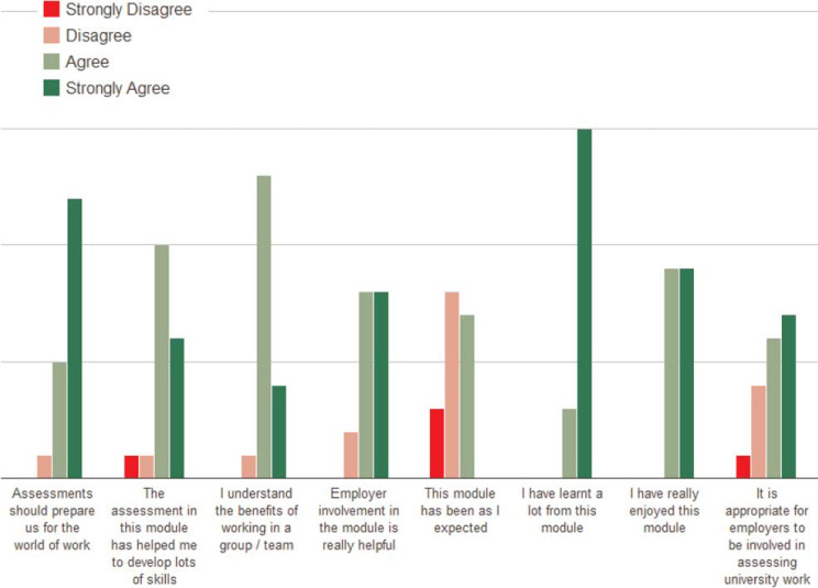The evaluation data as shown in Figures 7, 8 & 9 suggest that the overall “authentic” assessment approach taken by the project was effective and that the inclusion of employers in the assessment process was beneficial. Although some students commented that the module design was unexpected, data show that they enjoyed the module nevertheless, and they appear to have developed their skills as had been intended through the design. Detailed discussion focuses on the key aspects of the design.