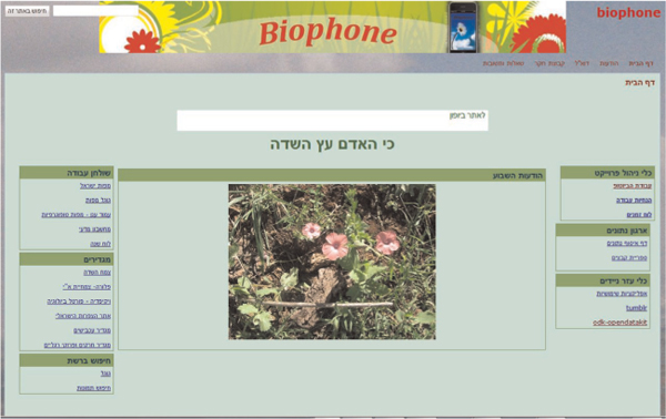 Biophone website. The boxes include: project management tools, data handling, mobile aids, workbench, reference books and search the web.