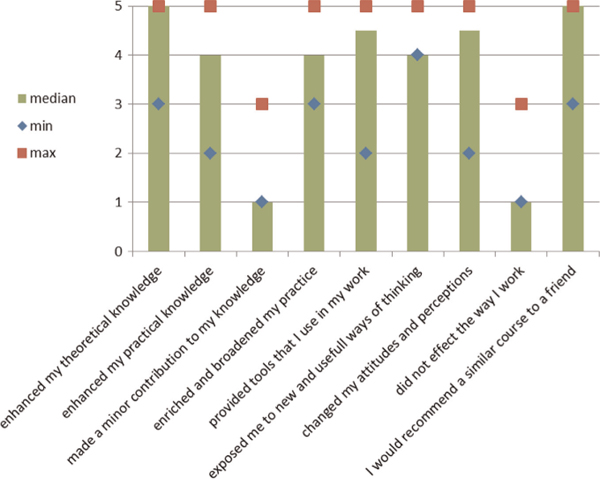 These results indicate that students acknowledge the long-term effects of the courses, both in terms of enhancing their theoretical knowledge and in terms of improving their professional practice.