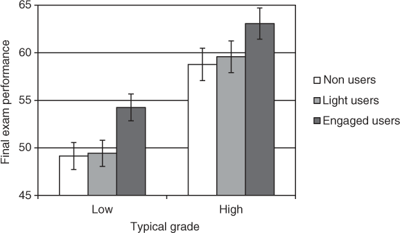 To illustrate these effects, we used a median split to divide the students according to their typical grade on other psychology courses, producing a ‘low’ and a ‘high’ group. We also categorised students according to their use of the wiki, non-user (0 edits, n=68), light users (1–3 edits, n=74) and engaged users (4 or more edits, n=74). The results can be seen in Figure 1.