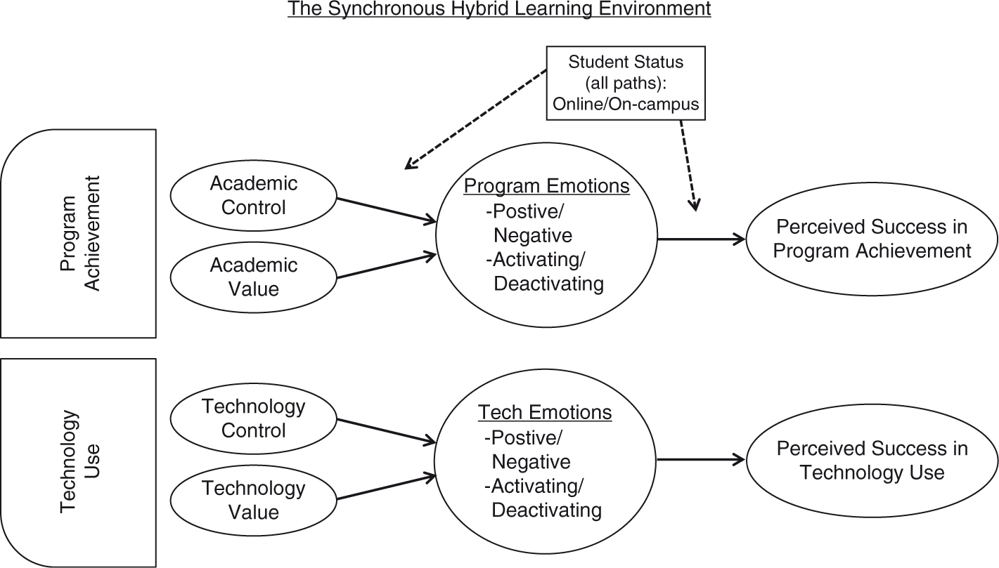 In many ways, technology is inherent to the learning environment experienced by many university students. Indeed, there is a growing population of students who earn a postsecondary degree entirely though technology-enriched course options such as synchronous hybrid delivery. While this format may improve access to higher education, it is important to note that synchronous hybrid learning environments affect the relationships among students’ control and value appraisals, emotions and perceived success in the domains of programme achievement and technology use. Ideally, explicating the role of achievement emotions in synchronous hybrid courses will help educational practitioners shape these technology-enriched learning environments in affectively beneficial ways.