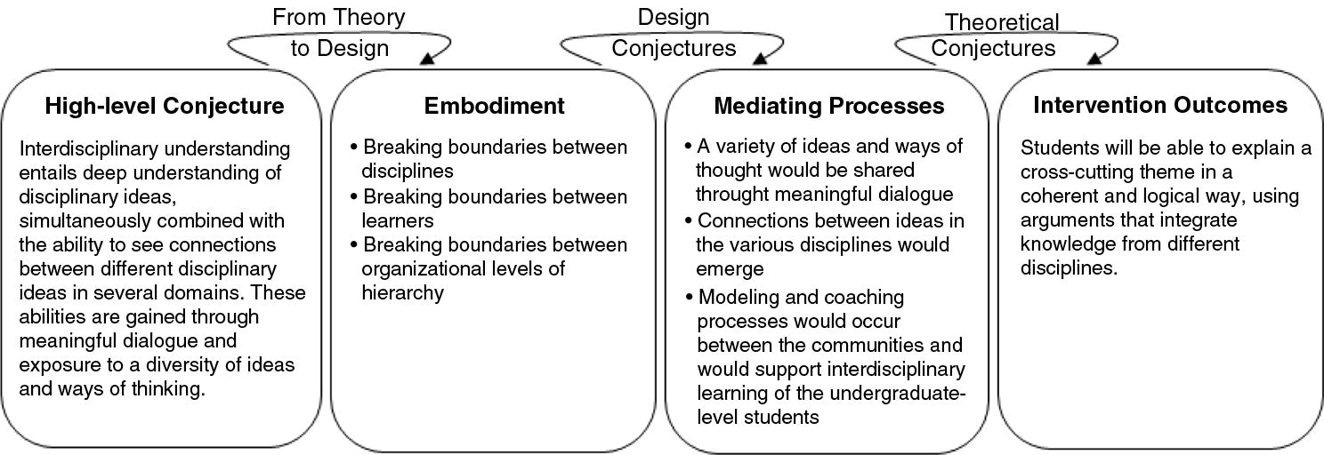 This work was initiated with our high-level conjecture (Sandoval 2014) that meaningful dialogue with peers and experts supports both a deepening into ideas in one knowledge domain and developing connections between ideas from several domains, which are both required for the development of interdisciplinary understanding. We assumed that the affordances of technology would support and enable these processes.