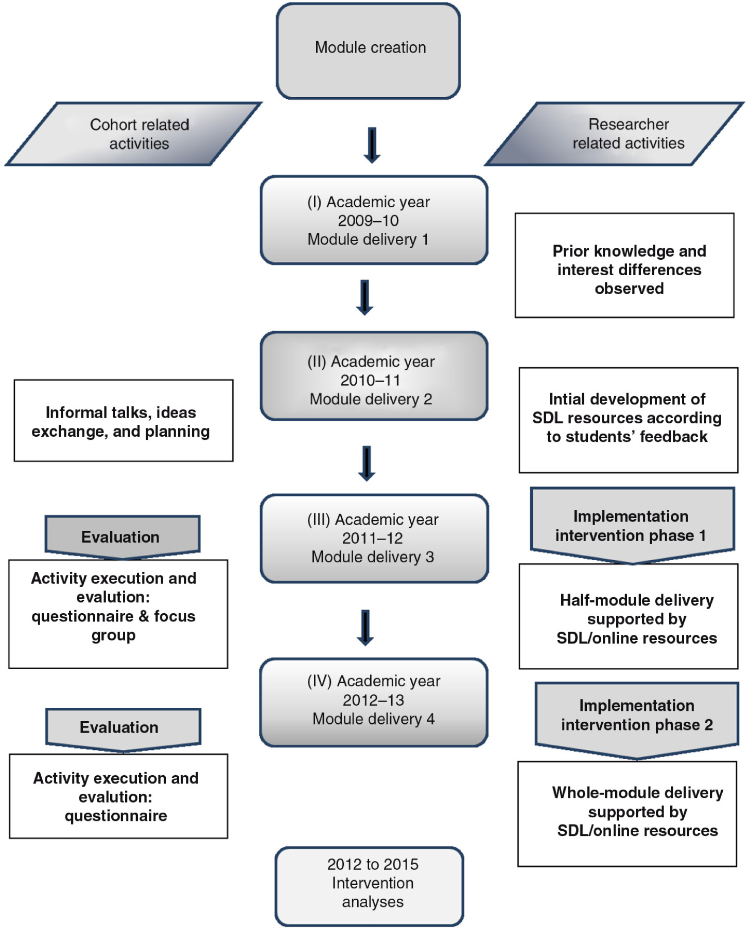 This work covers a period of 4 years, from academic session 2009–10, when the module was delivered for the first time, to 2012–13, its fourth year (Figure 1). The problems relating to student diversity were first identified in the session 2010–11. Staff responses, intervention phases 1 and 2, followed in 2011–12 and 2012–13, respectively. In intervention phase 1, half of the face-to-face module activities were complemented by online resources activities (ORAs). Intervention phase 2 saw the online activities extended to the whole module (Table 2).