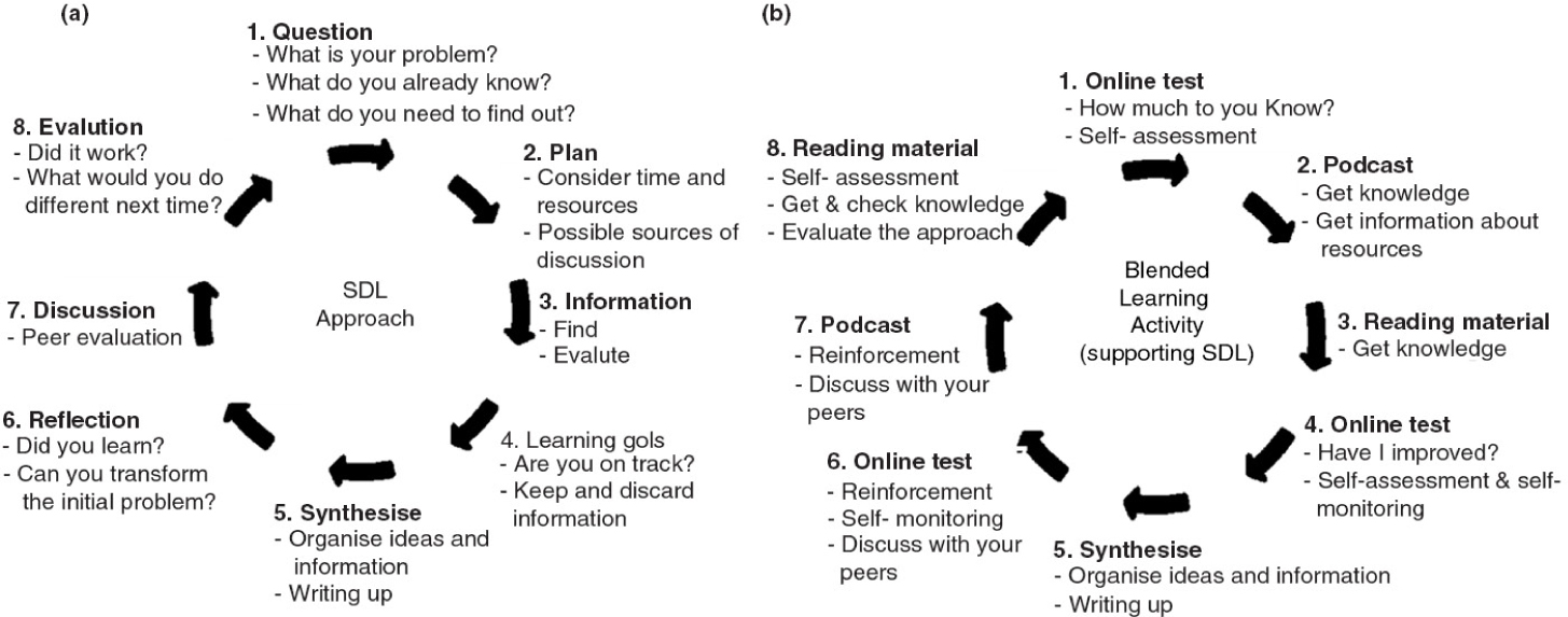 (a) The key questions designed to support an SDL approach. (b) The blended learning activity designed to support SDL.