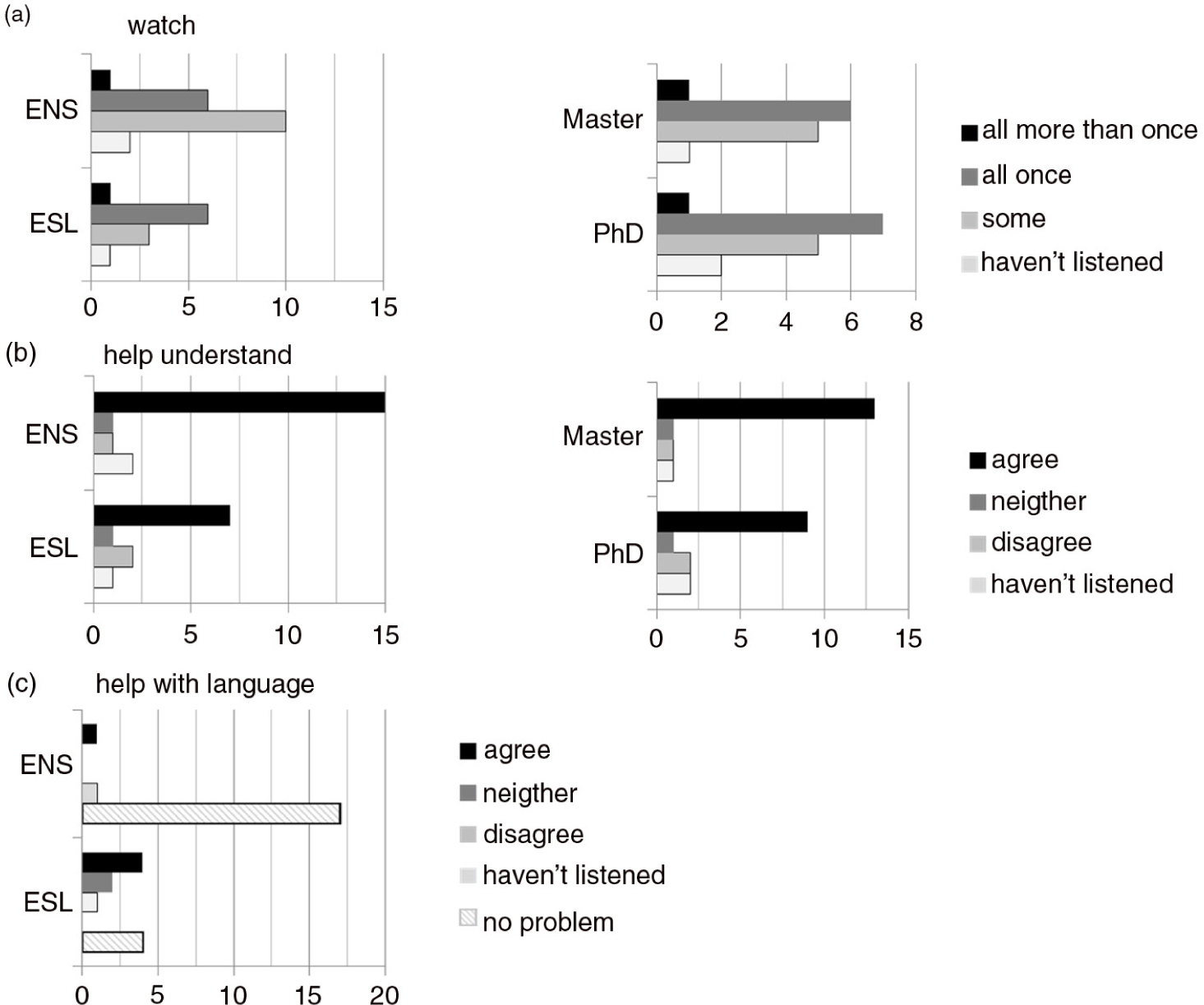 Students’ views on the podcasts (cohort 2012–13). Number of students from each category: programme and language who (a) watched the podcasts; (b) level of agreement with the questionnaire statement ‘the podcast helped with lecture and workshop content understanding…’; (c) level of agreement with the questionnaire statement ‘the podcast helped with my language issue…’. Total number of students=30, ENS=19, ESL=11; Masters=16, PhD=14; Likert scale. ENS: English native speaker; ESL: English as second language.
