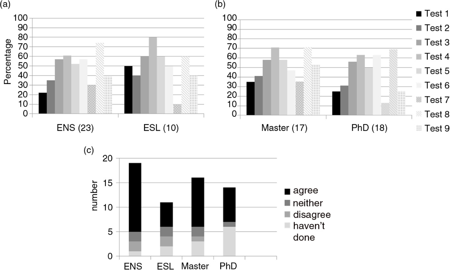 Students’ attempts at online tests (cohort 2012–13). Percentage of students from each category: (a) ENS (English native speaker) and ESL (English as second language); and (b) Masters and PhD students who took each of the five online tests. N=the number of students in each group is indicated in parentheses. (c) Number of students from each language and degree groups who agreed with the questionnaire statement ‘the online test helped with my self-assessment…’