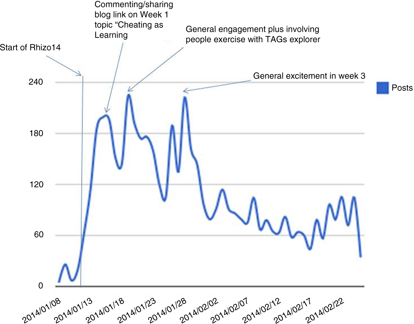 Networking was evident in all of the platforms in the busy early weeks of Rhizo14. There was also a networking activity, promoted by the course leader for community building. This used TAGS Explorer which provided a visualisation of connections on the Twitter hash tag (Cormier 2014b). Twitter users were encouraged to ‘click on lonely dots’ to draw participants into interactions, and this was generally welcomed by participants. This resulted in a flurry of activity, but it was short-lived (Figure 3), and there was no corresponding activity detectable in Facebook (Figure 4).