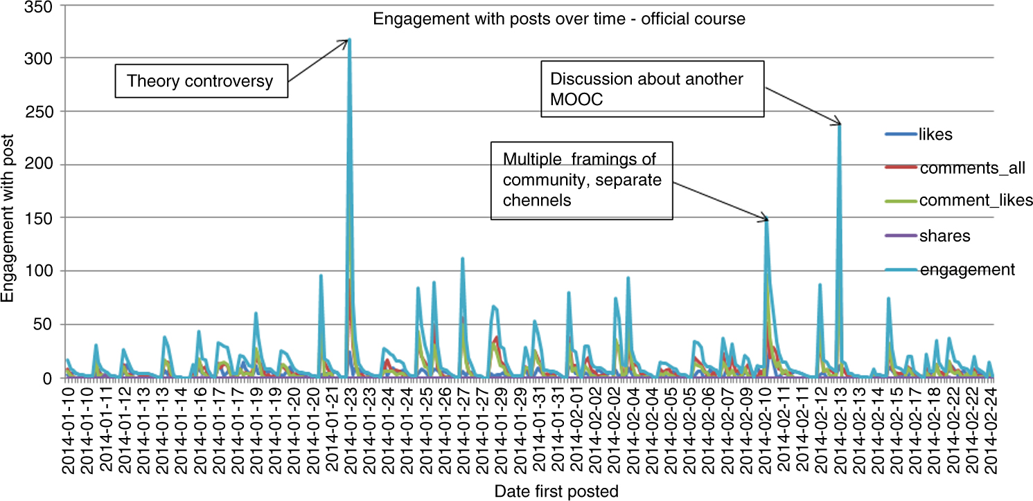 In Rhizo14, Twitter and Facebook were the most active spaces that supported participant observation. What stood out in the activity data was that in Facebook, unlike on the other platforms used in Rhizo14, there was an increase in the number of posts, and an increase in engagement with posts and by users (see Table 2). However, whilst activity in Facebook increased overall, it was focussed on a small minority of participants. In the official course, the top 10 of 239 active participants accounted for 47% of the engagement in Facebook increasing to 67% during the unofficial course for the top 10 of 198 active participants (see Table 2).