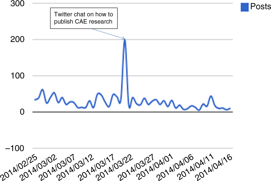 Tweets (posts on Twitter) by date in unofficial course via TAGS Explorer and netlytics.org. CAE is Collaborative Auto Ethnography.