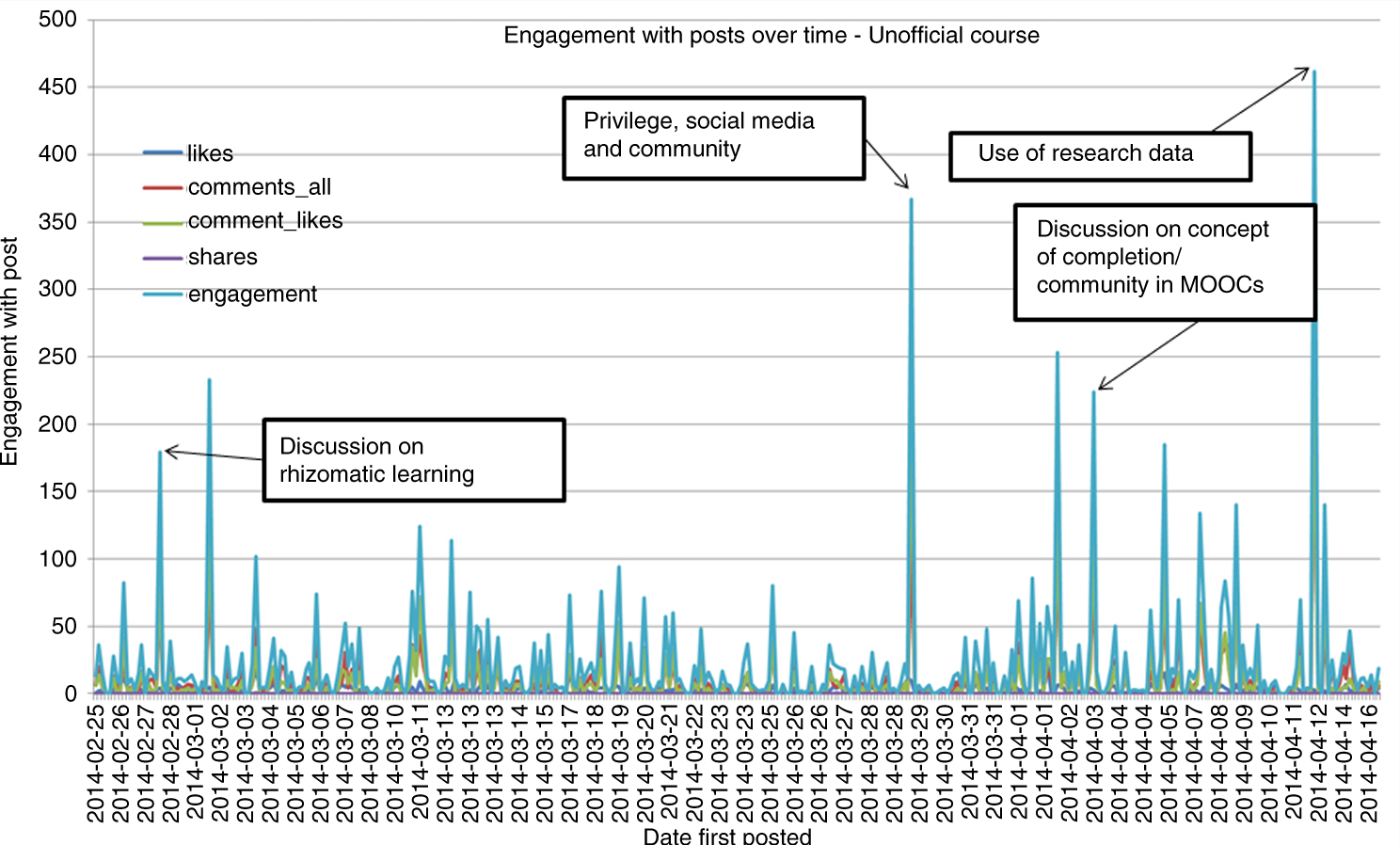 We have no way of knowing where and how those standing on the sidelines, or turned off by an enthusiasm for community, were engaging with Rhizo14. There was no designated main community space. They could have been posters of Facebook posts that attracted no engagement (14 in the official course, and 13 in the unofficial course).