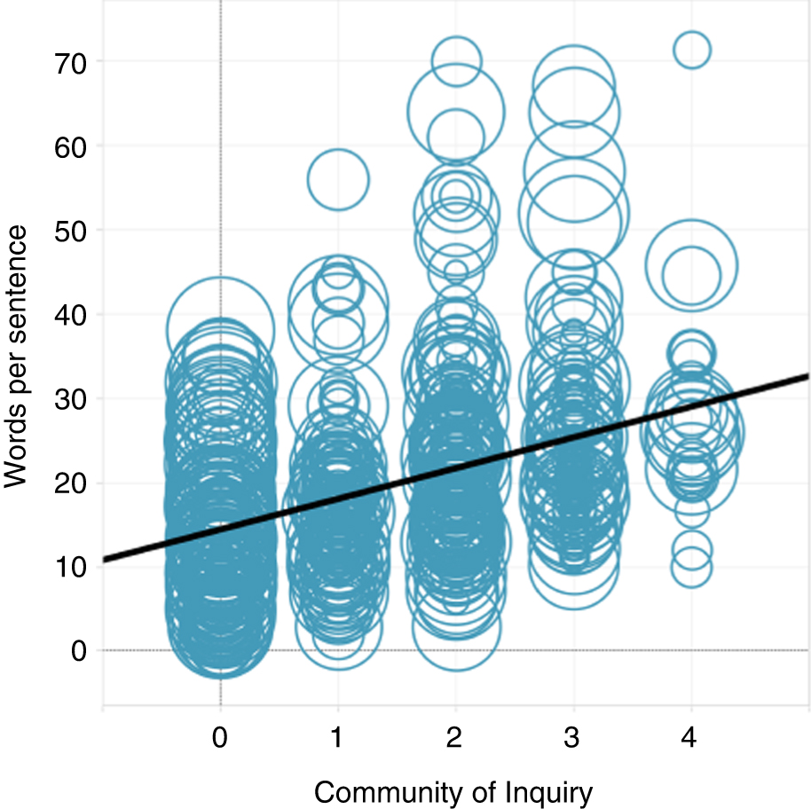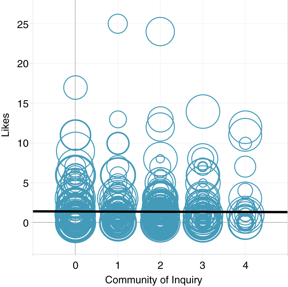 Looking further, our future work will endeavour to build on this broader CA and the linear regressions presented in this paper, and engage with machine learning (ML) techniques to develop real-time, automated feedback systems. The potential of ML’s computational processes is in the combination of multiple metrics (e.g. CA scores, word counts and sentiment) in order to predict PVs and provide meaningful feedback. Our expectation is that ML-based tools may be employed to support self-directed learning, enable educators to identify those learners who are experiencing difficulties as well as those who are doing well, and help learning technologists design more effective CSCL environments. In order for educators to successfully manage the high volume of diverse learning interactions inherent in massive courses, the development of this type of software is becoming increasingly important.