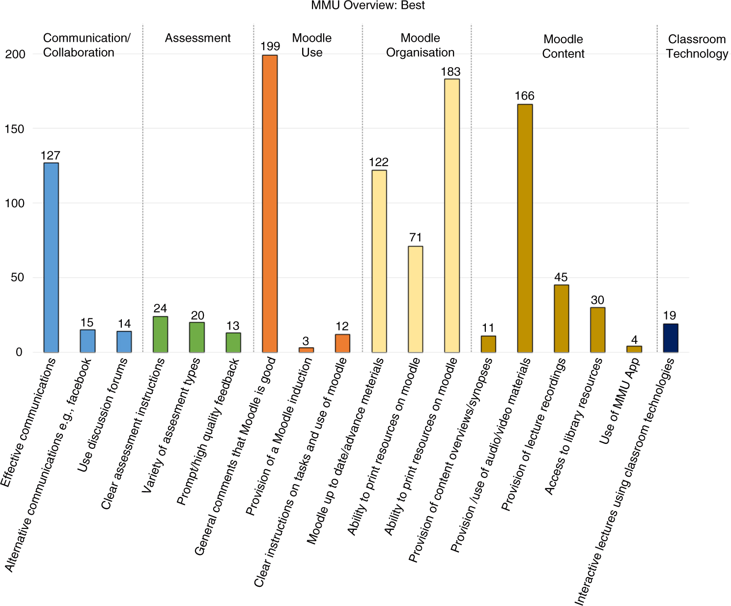 The revised codes were charted to produce initial visualisations of the data at an institutional and faculty level. Initially, these were bar charts as shown in Figures 1 and 2. Here the occurrence of the codes was plotted across the meta-themes and themes. Firstly the ‘best’ elements of the programme/unit were plotted.