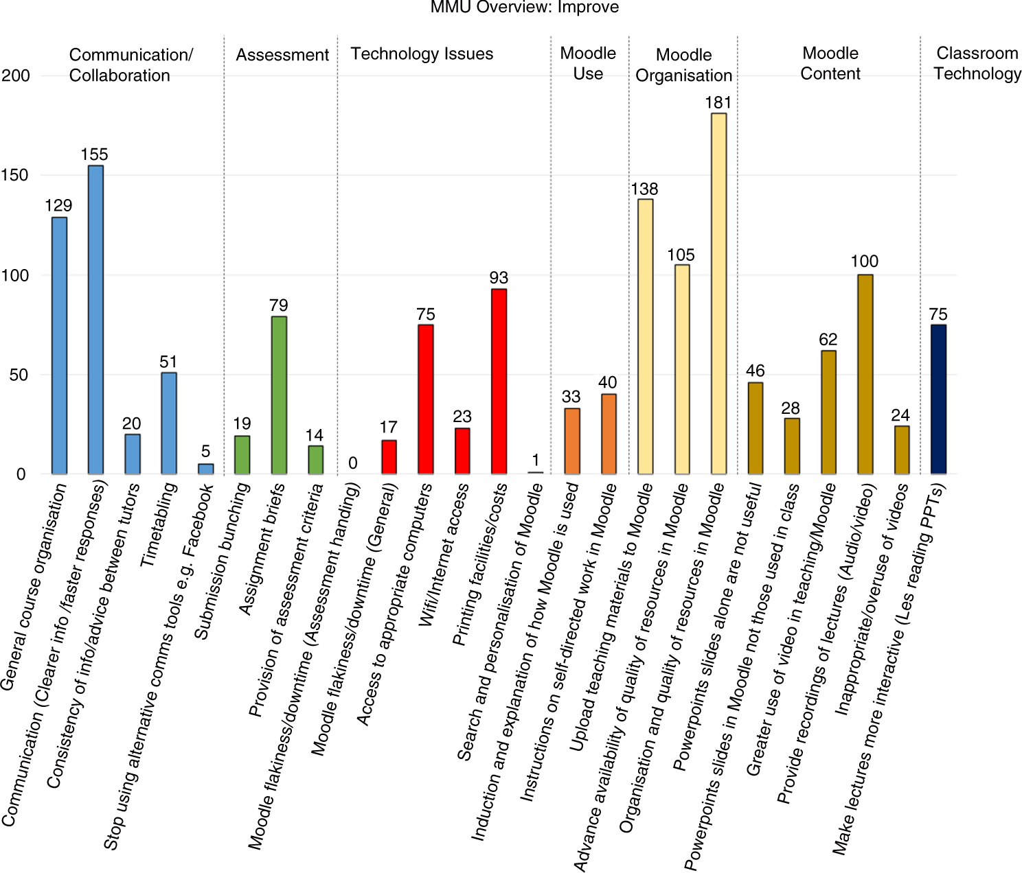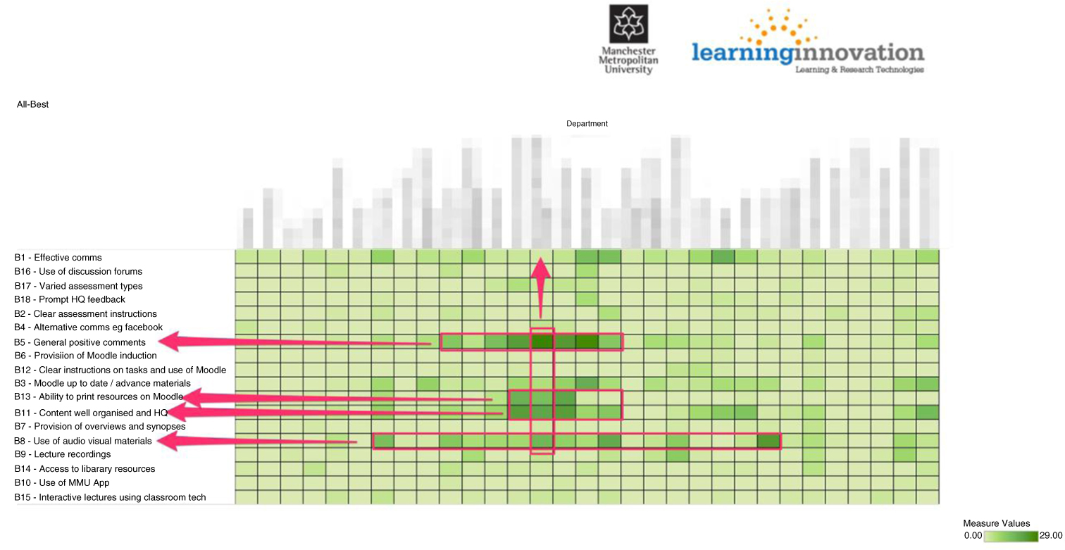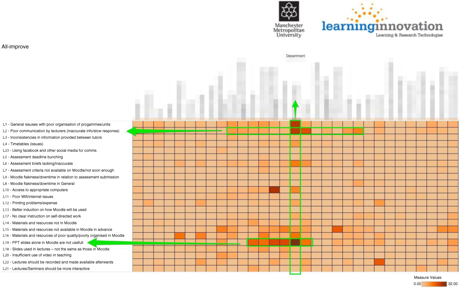Similarly, the representation of areas for improvement indicates areas of practice that need development at an institutional level by strong colour banding in horizontal themes. These may indicate areas of focus for institutional concern. Strong vertical colour banding indicates particular departments that may need further support or interventions at a faculty level to support development. This can be seen in Figure 4, here several themes show particularly high colour strength indicating a high degree of student comment. For example, areas of concern in Figure 4 are Communications and the use of PowerPoint slides in the VLE.