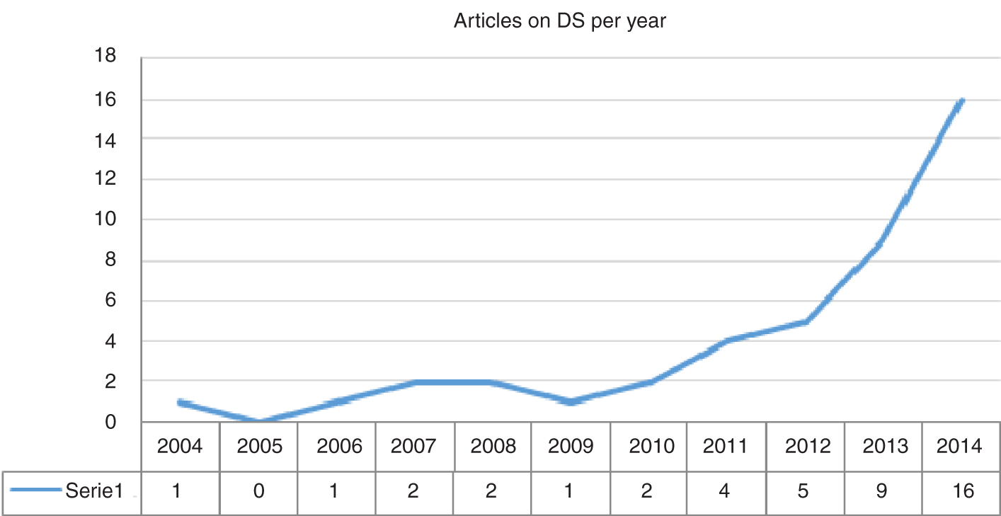 This section presents the results of the first phase of work, the systematic review. Figure 1 shows that Digital Scholarship appears to be a fairly recent field of research, dating back to 2004 (although rooted in previous literature on scholarship), featuring a significant increase in papers on scientific productivity in the years 2013 and 2014 (the yearly number of papers almost doubled between 2012 and 2013 and doubled again in 2014); this highlights a fast emerging field of research. In addition, the papers are well distributed amongst several journals belonging to different subject areas, which confirm the relevance of the topic for different disciplines.