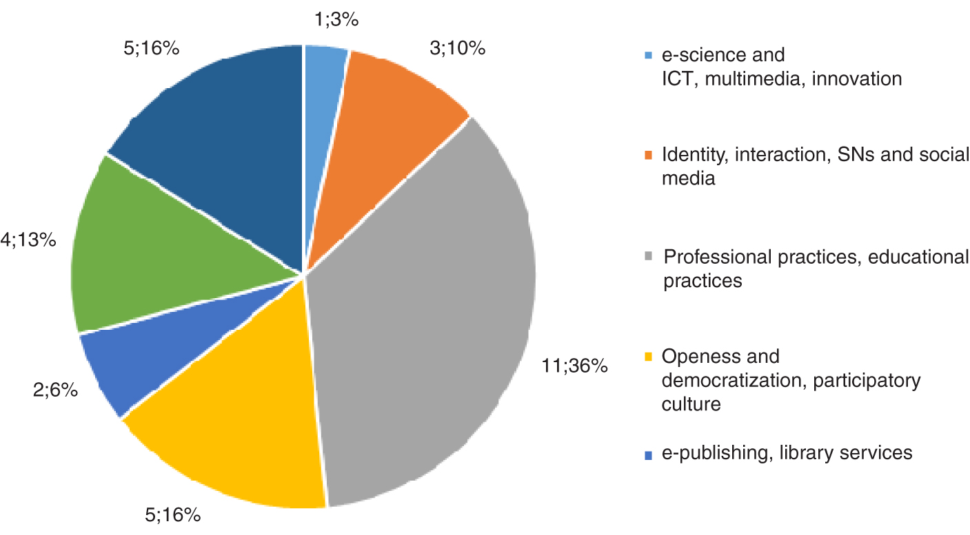 During this process of analysis, the researchers observed co-occurrences of keywords between papers dealing with the topics: “professional practices, educational practices”; “openness and democratisation, participatory culture”; and “digital identity, interaction, SNs and social media”. These three topics together, respresent 62% of the sample. Besides, the topics of “e-publishing, library services” shared several keywords with “e-science and ICT, multimedia, innovation”, representing together 19% of the sample. Lastly, the topic of digital art and history appeared to be a stand-alone category.