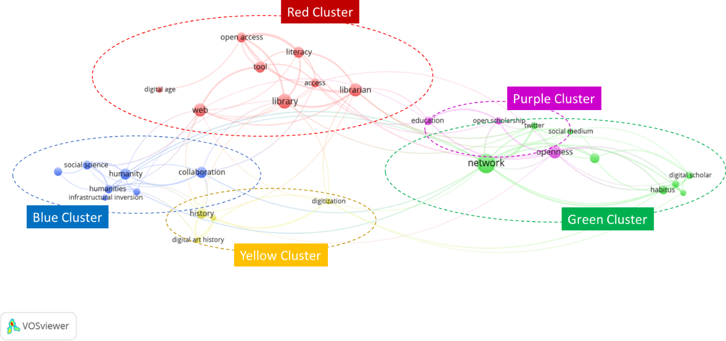 The map of co-occurrences of keywords is a representation based on the number of occurrences of keywords within the ‘corpus’ of terms extracted from all the titles, keywords and abstracts of the articles within the sample. The software VOSViewer extracts all the ‘noun-phrases’ from the corpus; therefore, the terms are organised by topics automatically generated by the software, namely the keywords. In this case, from the original corpus, the software extracted 1,198 relevant keywords from a sample of 6,898 terms. A total number of 73 nodes emerged; however, only 44 (60%) of these keywords are considered by the software for representational purposes. Moreover, the authors removed irrelevant or ambiguous keywords from the representation such as too general terms (e.g. issue, author, purpose, role, publishing, scholar, academic, survey) or terms which conditioned the visualisation of a cluster, such as teaching, publication, implication, challenge and collaboration. The final representation, composed of 35 keywords/nodes, is shown in Figure 4, where three bigger clusters and two smaller clusters are identifiable. Table 2 introduces the details of keywords for each cluster, while in the second column, we have associated each cluster with the relevant perspective. Cluster 1 (in red at the top of Figure 5), contains eight nodes, with ‘Library’ as its main node, and was connected semantically with the view of Digital Libraries research, focusing on the role of infrastructures allowing new ways of scientific production, the problem of preserving and using content, and the role of Libraries and librarians in scientific information. On the right-hand side in Figure 5 (in green), cluster 2, with the central word ‘Network’, contains eight nodes. This cluster appears to be semantically connected with the perspective of ‘networked (and open) scholarship’ seen as scholars’ endeavour to embrace the social web with all its affordances to promote new practices (such as opening up education and research) in line with a new deontology of Public Engagement. Cluster 5 (in purple), in between clusters 1 and 2, features ‘Openness’ as the main node, relates to the issue of open access to content and to open scholarship as professional practice. Hence, this small cluster brings some evidence of the existence of contaminations between the Digital Libraries and the Networked Scholarship perspectives. The third biggest cluster, cluster 3 (in blue), at the bottom-right of the map, is composed by seven nodes, and its main nodes are ‘humanities’ and ‘collaboration’. We can assume that this cluster aligns with the perspective of Digital Humanities, dealing with how researchers interact with new digitised objects within the humanities as well as how the field evolves as an interdisciplinary field, between computer science and the humanities. Cluster 4 (in yellow), a small cluster whose main node is ‘history’; is tightly connected with the Digital Humanities perspective. In Figure 5, this cluster is rather isolated, and specifically there are no nodes that can be attributed to the view Networked Scholarship/Digital Humanities, which seems to be in line with the very small overlapping between these two perspectives already shown in Figure 3.
