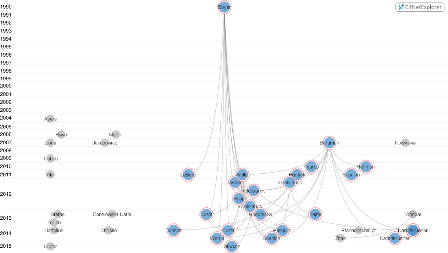 Besides, there are very few cross-citations (lateral lines) between authors within the network. This emerges from the identification of the core publications (12 in total); these are publications that have at least a certain minimum number of citation relations with other core publications, taking into account that incoming and outgoing citation relations are treated identically. The 12 publications identified mainly coincide with the Networked Scholarship perspective identified in the prior phase.