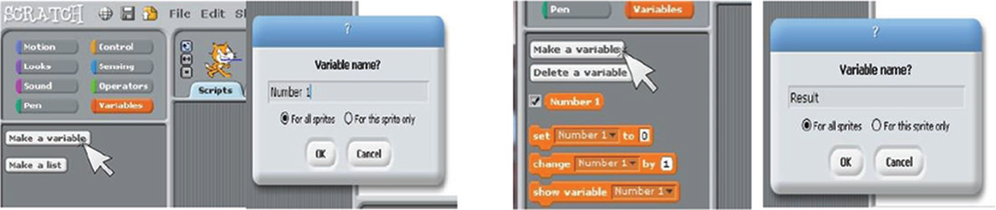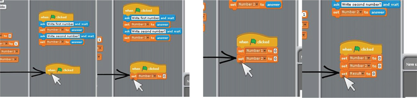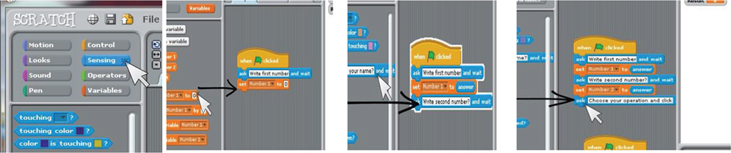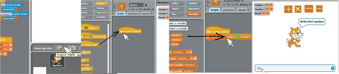 In the four concepts, we have observed that students provided more effort in the operators than the condition (if) concept. They encountered with difficulties, especially in creating variables and using operators on the Scratch blocks. Even though students worked on the operators only with basic addition operations, they took a long journey to complete the tasks. Figures 1, 2, 3 and 4 present the blocks, sprites and students’ navigations in the tasks. The below example includes the solution steps for the activity of creating a calculator about the operators concept.