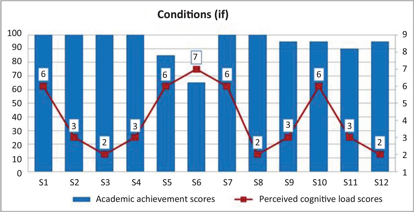 The measurements in the condition (if) concept indicated that the AAS of the group was quite high, which was 93.75, and the CLS of the group was relatively low, which was 4.08. According to these measures, in the condition concept, students with high AAS generally got low CLS. Where only six students’ achievement scores were 100 points, most of them had low CLS. (S2, S3, S4 and S12 had the lowest CLS value in the score range of 2–3). It is remarkable that one of the students got the highest CLS (7) and the lowest AAS (68).
