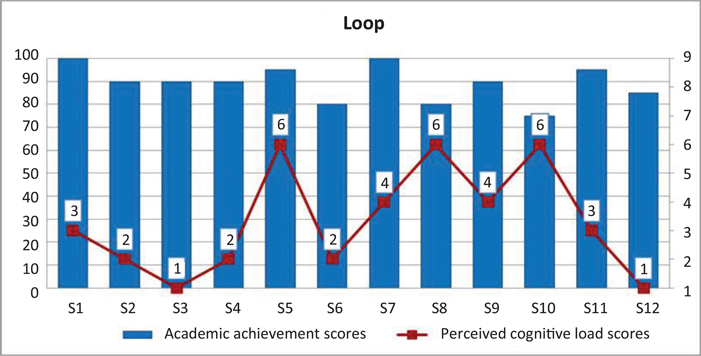 According to the measures in loop concept, the AAS was 89.2 points and the CLS was 3.33. Interestingly, the average value of CLS in this concept was lower when compared to the other concepts. On the contrary, AAS in the loop concept was found to be quite high and the lowest AAS was 75 points. Most of the students got 90 points as achievement score. Surprisingly, S5 got a relatively higher score of cognitive load (6) than other students and his AAS was also higher than the others’ scores. The scores of S8 and S10 support the idea that when CLS increases, AAS decreases. For example, as two students (S1 and S7) got the full score of academic achievement (100 points), S1 got the average CLS of 3 and the other, S7, got the average CLS of 4 and their average CLSs were not the lowest. As a result, it is not easy to define an accurate relationship between the CLS and AAS in this concept. Including all the concepts, the relationship between AASs and CLSs is illustrated in Figure 10.