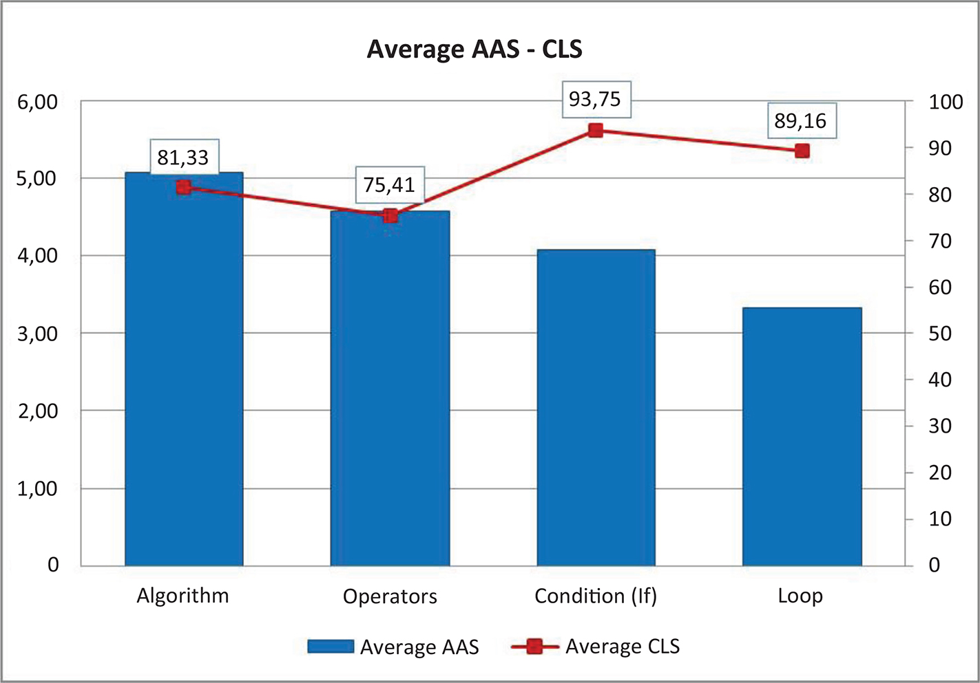 It is found that except the loop concept, there is an inverse relationship between average AASs and CLSs. The lowest CLS was induced in the loop concept, but the highest average AAS was observed in the sequences concept. The AAS from highest to lowest scores was for condition (if), loop, sequences and operators concepts, respectively.