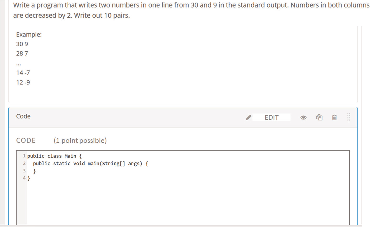 The unit test must be placed in the <grader_payload> section of the XML file that also contains the text of the task as well. Figure 4 shows a screenshot of a task and a text box in which the student can code or copy the programme code.