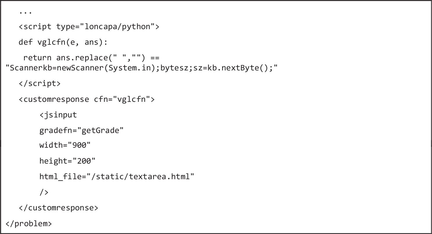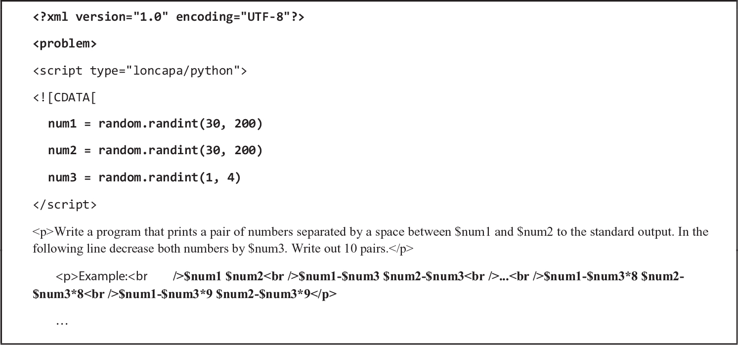 The assignment is represented by an XML file internally. This format allows the system to be extended for external graders. Figure 3 represents the skeleton of the XML file in which a problem can be coded.