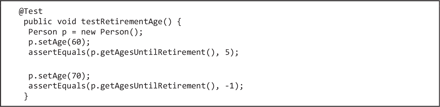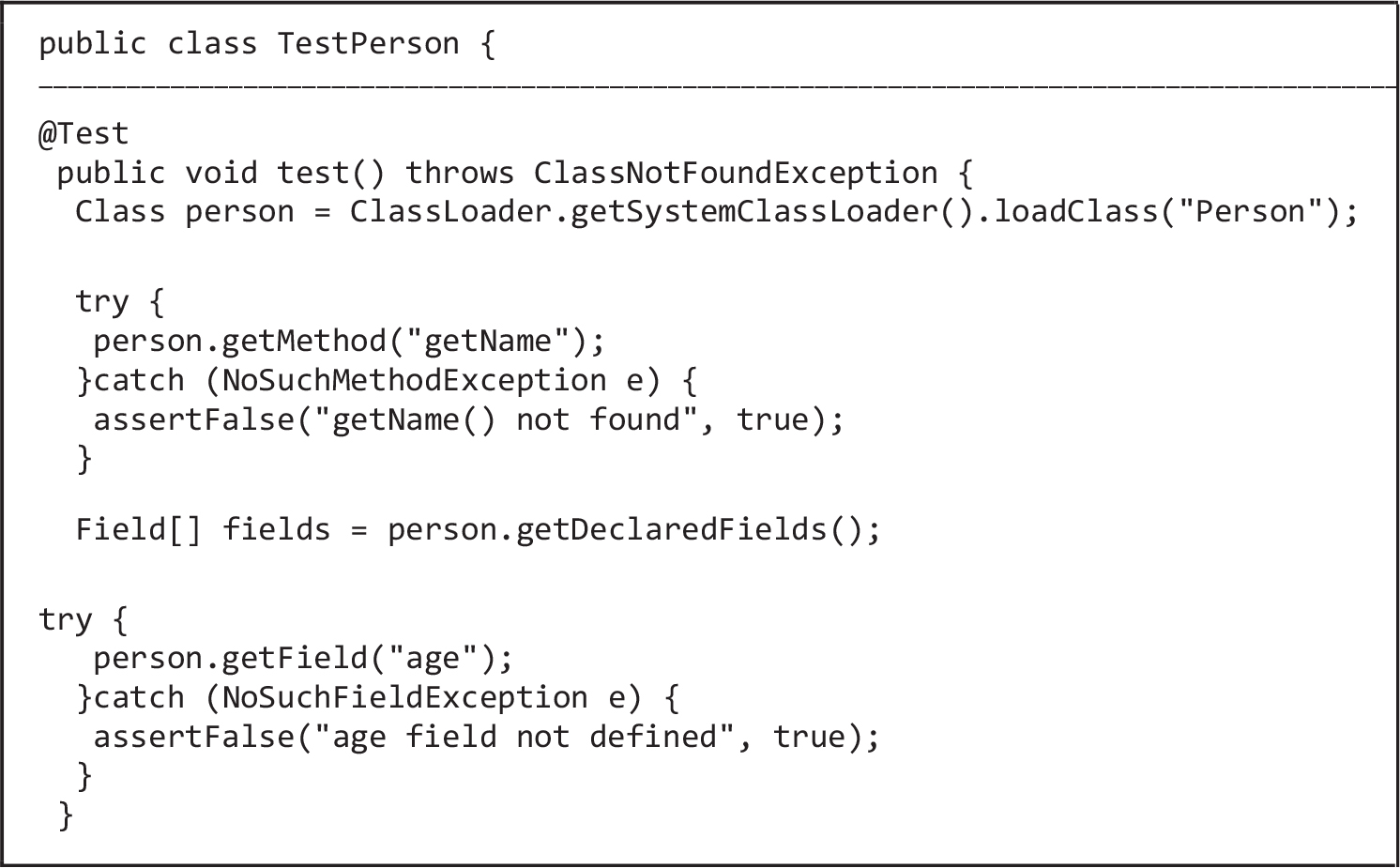 Figure 7 shows an example how to check member variable ‘age’. The code gets the fields of ‘Person’ class, and the corresponding unit test fails if ‘age’ is not found.