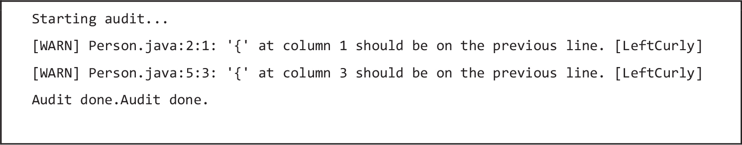 As mentioned above, this method is not preferred, so an advanced method was used to check coding style. Checkstyle is a highly configurable tool to help professional programmers write Java code that adheres to a predefined (Sun or Google) coding standard (Checkstyle – code style analysis tool for Java 2016). It defines a set of modules, which can examine common styling mistakes, for example, wrong naming conventions of classes, methods and attributes; presence of mandatory headers; and improper use of imports, scope modifiers, instruction blocks, long line lengths, complexity measurements. In Figure A.2 in the Appendix for codes, curly bracket formatting problems are demonstrated as an example. Google Java Style Guide (2016) defines the proper usage of braces, and the following code violates it. Running coding style check from a shell, Checkstyle detects these problems; see Figure A.3 in the Appendix for codes.