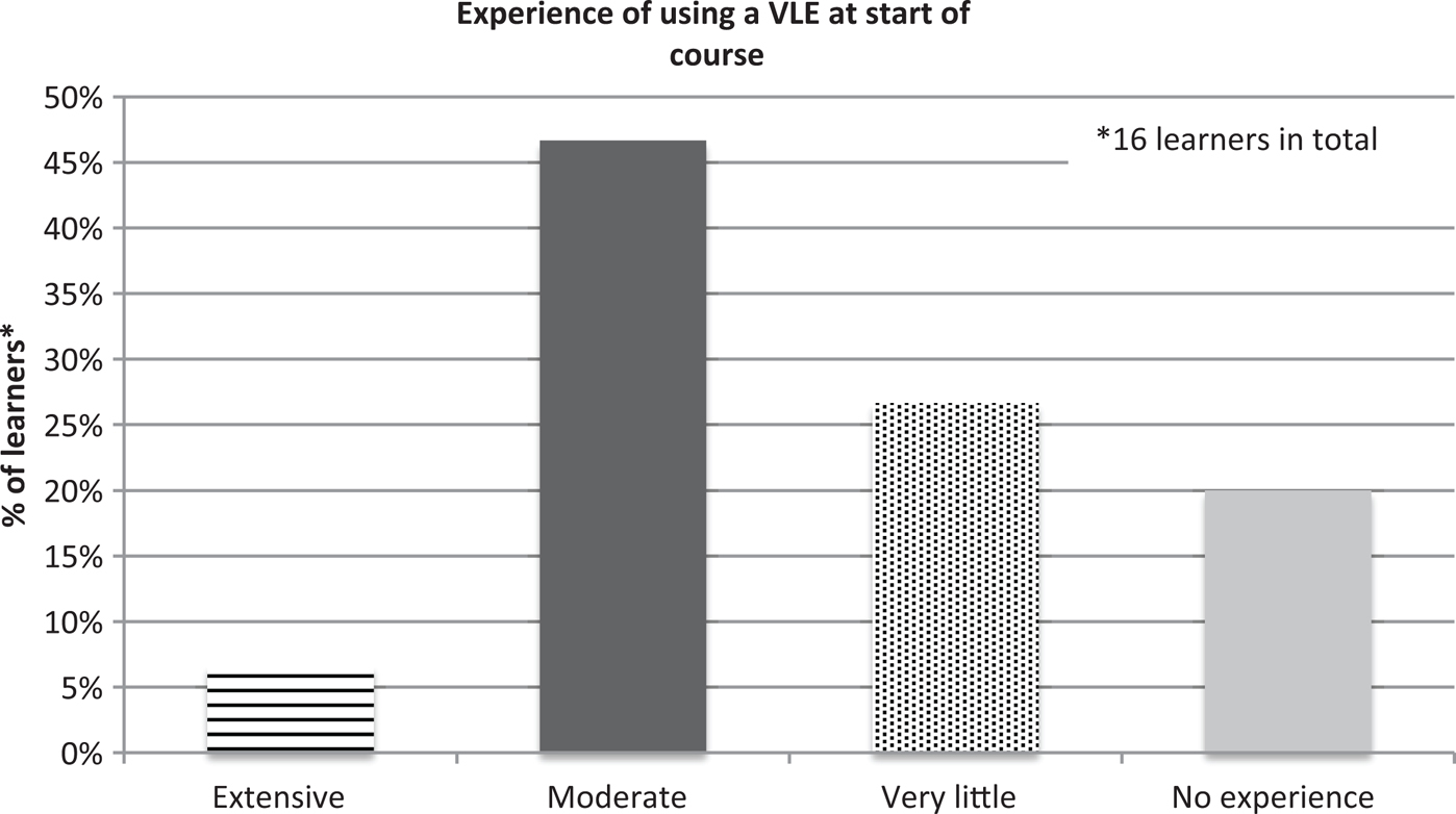 Of the 16 unique respondents (several of the learners were studying both courses), exactly half said that they had previously studied a course with an online element. Over 50% (9 learners) had ‘moderate’ to ‘extensive’ experience of specifically using a VLE. Fewer than 20% (3 learners) had no experience at all of using a VLE (Figure 3). In terms of online fora, over 60% of the group (10 learners) had ‘never’ or ‘not often’ used an online forum, although those that did use them tended to use them ‘very often’ (30% – 5 learners). Further quantitative data were gathered on how frequently learners engaged with the online tasks and collaborative work areas, including data on the number of views and the number of interactions, but the findings are of less interest in than the findings from the qualitative data.