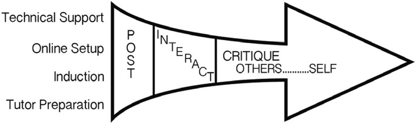This latter stage should develop higher order thinking and critical thinking skills through interactions with other learners, other online resources and finally by critiquing the learner’s own work, or challenging ideas of others. This has some similarities with the later stages of the existing models, but unlike Salmon’s model, focuses directly on the learner and learning outcomes, rather than the role of the e-moderator, or the specific types of tasks that might be included. This permits the course instructors to mould the arrow head to suit the desired learning outcomes from the course, as well as being responsive to the needs of the particular cohort in question.