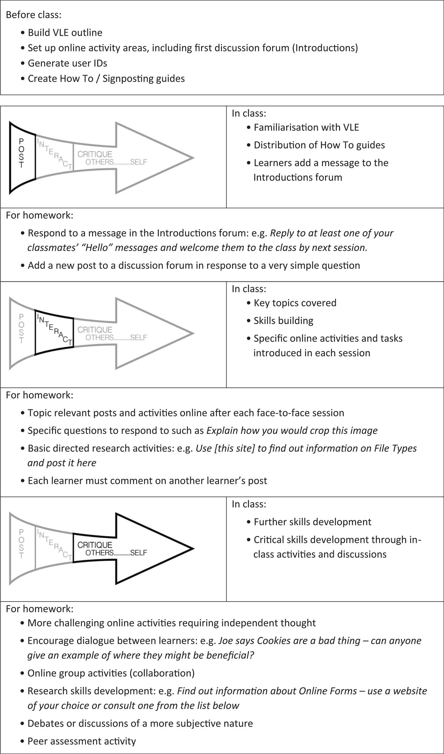 The following plan demonstrates how the arrow model could be implemented. Aside from the pre-course preparation and the introductory forum, each phase may blend into the next (or previous) and therefore the plan should not be viewed as a rigid process where one phase must be completed before the next starts. Examples of activities are given for illustrative purposes only, and will need to be designed according to the subject, medium of delivery and cohort (Figure 5).