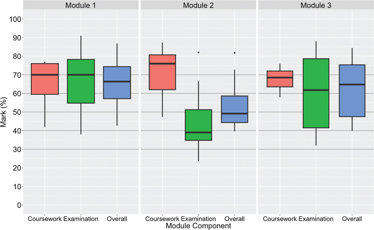 Figure 1. A graphical representation of the coursework, examination and overall marks obtained by students in Modules 1, 2 and 3 based on boxplots.