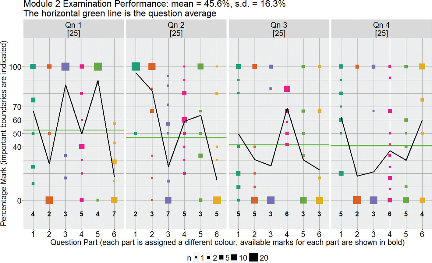 Visualisation 2, shown in Figure 2, records the marks achieved by every student on each question part of Module 2’s examination. The size of the plotting symbol depends on the number of overlapping points or students that it represents. Square plotting symbols are used because their sizes are more easily identifiable than round symbols. The marks for each question part are at the bottom, while the marks for each whole question are at the top. The average mark for each question part (black line) and for each question (horizontal line) are also shown. The average examination mark and its standard deviation are given in the title. From the horizontal lines, it can be seen that the average question performance has decreased from just over 50% for Question 1 to just over 40% for Question 4. Parts 2 and 6 from Question 1; 3 and 6 from Question 2; 3 and 6 from Question 3; and 2 and 3 from Question 4 seem to have caused some difficulties, with students scoring on average below 30%. Most question parts provide performance discrimination, except possibly part 5 of Question 1 and part 1 of Question 2. The aims of Visualisation 2 are to provide a tool for students to assess their performance relative to that of the group, for academics and students to understand areas of strength and weakness in learning and for external examiners to pin-point problems in student performance.