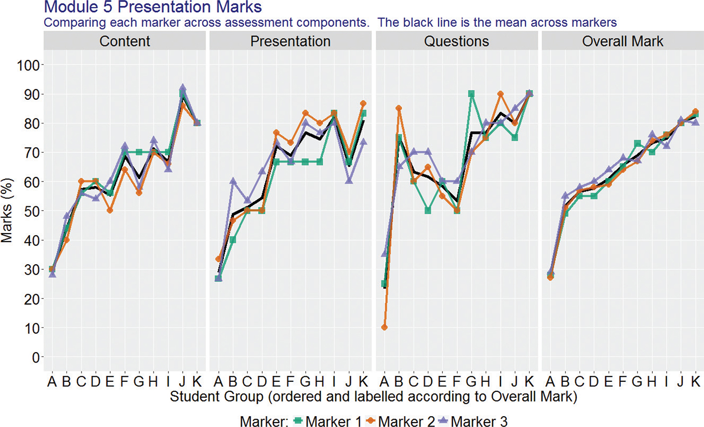 As part of the assessment of Module 5, students were required to make a group presentation. Three markers assessed 11 groups in the following categories: content (assessment weight 50%), quality of presentation (30%) and responses to questions (20%). Visualisation 4, shown in Figure 4, presents the percentage mark awarded by three markers to 11 groups in three assessment categories, together with the corresponding overall marks, which are used to order the groups. The mean mark across the three markers for each group in each category is also shown by a black line. There appears to be some variation in the markers’ content, presentation and question marks, but no marker stands out as being substantially different from the others. Because the overall mark is a weighted average of the marks in the three categories, the variation between markers is noticeably less. It is not expected that Visualisation 4 would normally be shown to students, as it is a management quality assessment metric.