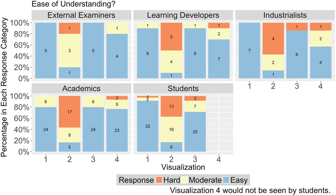 Figure 5 presents the responses to the question ‘How easy do you find this graph to understand?’ for each of the four visualisations, split down by respondent group. In order to obtain a parsimonious representation, Very Easy and Easy were combined into one response category ‘Easy’, and Hard and Very Hard into ‘Hard’. Most respondents said that Visualisations 1, 3 and 4 were easy to understand. However, the majority of respondents across all groups found Visualisation 2 less straightforward. One academic said that ‘Visualisation 2 allows the bimodal mark distribution of some question parts to be well understood’. An industrialist remarked that it ‘contains a great deal of information. However, once it is understood, it shows exactly where the problems are. Congratulations!’.