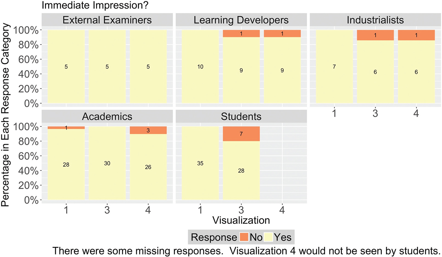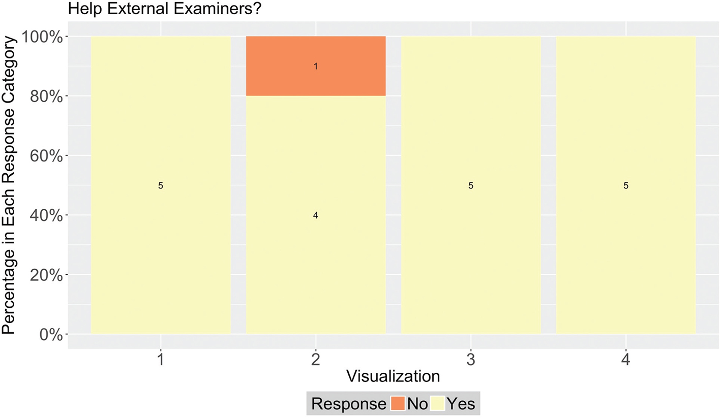 Figure 7 presents the responses to the question ‘Does this graph help you to do your job as an external examiner?’ For Visualisations 1, 3 and 4, there was complete agreement that these graphs helped. However, one of the five external examiners did not find that Visualisation 2 helped.