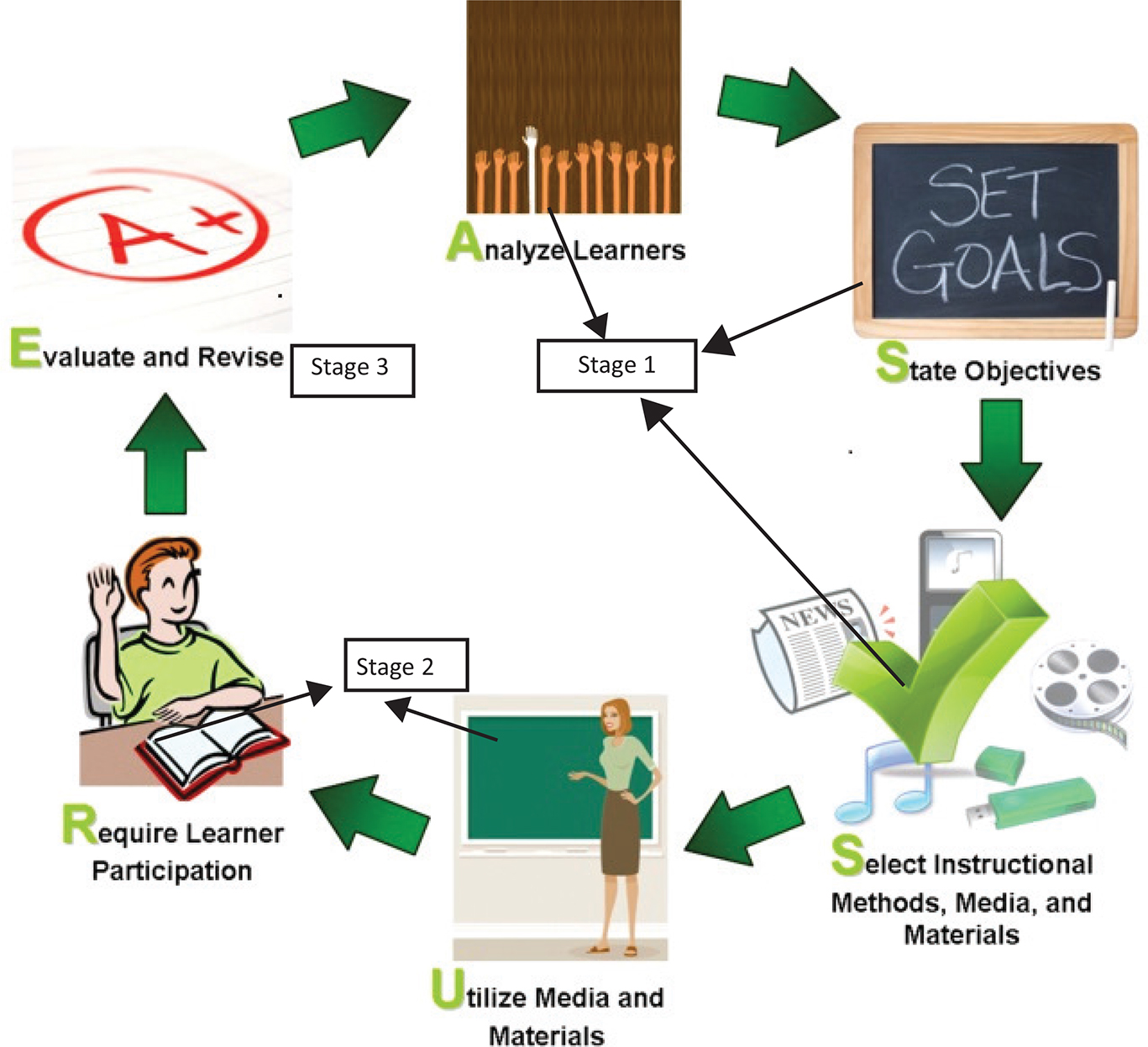 It should be noted that learners’ attitude, learning styles, economic background and love for media and technology remain a crucial factor in analyzing a learner-A (Analyze Learners). The tutor must ensure that a physical, social, economic and motivation level of a student(s) must be given strong consideration before the choice of technology usage. The objectives stated must be designed from the class curriculum and should match the technology to be used or the improvised media/technology-S (State Objectives). The process of media usage in classroom situation must be an all-inclusive exercise with intention of capturing students’ attention and building in them the attitude of skills regeneration and mental development. The students must be allowed to pragmatically express themselves either theoretically or practically-U (Utilize). Having allowed students to have a hand-on experience of the media or technology, the tutor must reaffirm his/her commitment towards effective teaching and with modern standard of teaching with technology. He/she must revise his/her teaching objectives together with his/her students and colleagues. This could be performed intermittently with teaching objectives-R (Revise). One of the qualities of a good tutor is that he/she must possess evaluation skills. Evaluation is very important in knowledge impartation either directly or indirectly; evaluation works in three ways: first, to check for objective delivery; second, to ascertain level of students’ understanding; and lastly, to establish tutors’ expert rate-E (Evaluation). Once the first three stages have been completed successfully, the actions and processes involved should be documented and sent for endorsement. During this stage, stakeholders such as administrators, tutors, computer experts, students and policy-makers must have an impact on the material, objectives and processes involved before it is documented.