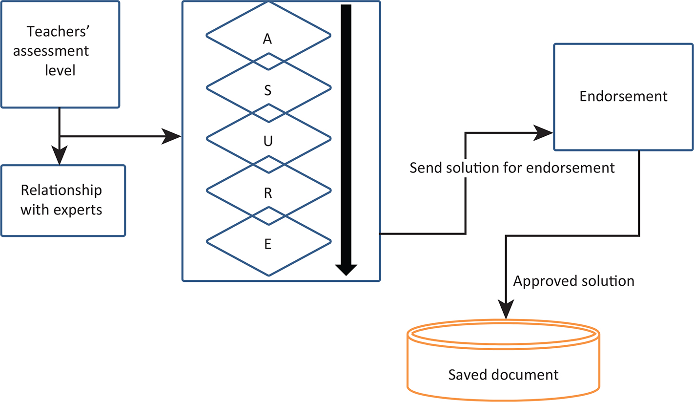 Based on the challenges identified earlier, the TREASURES Model is modeled to help curb the problems encountered in the adoption of ASSURE Model in Nigerian institutions. The educational sector in Nigeria has peculiar problems which are not in developed countries. So, a peculiar solution should be addressed internally with internalized solution. The TREASURES Model (as shown in Figure 2) is a combination of series of steps that would yield solutions to problems identified. The stages are Teachers’ Assessment Level, relationship with other experienced teachers on the choice of identifying right media and technology, the ASURE itself, endorsement of tutor’s improvised solution (media/technology process) stage and a database for documentation (blueprint). The model is represented in Figure 2. The first stage is Teachers’ Personal Assessment Level: A stage where the tutor personally assesses the teaching skills and technical know-how of available resources. He/she also does a refined assessment of his/her technical know-how of the technology to be used or on how to improvise a new technology/media in line with teaching objectives. At this level, the tutor is expected to become a learner not a teacher, a learner because he/she must demonstrate convincing skills before his/her intelligent learners. Having learnt how to handle the improvised technology/media, the tutor should endeavor to interact with experienced tutors in order to identify shortcomings or to correct perceived skills that are learnt wrongly. This process will further open up further possibilities in knowledge creation and skills acquisition. Next to this stage is the ASURE Model represented in spring mode. (It is represented in spring mode because all the processes must be done interrelated.) The ASURE means Analyze Learners, Select Materials/Technology, Utilize Materials, Review Materials and Evaluate the solutions.