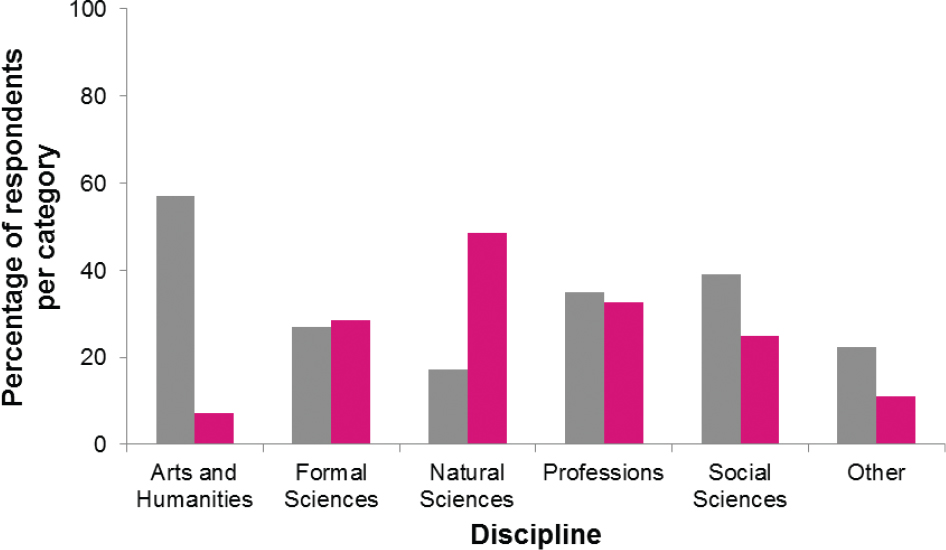 Figure 1. Percentage of respondents per discipline who used the academic SNS Academia.edu (grey bars) and ResearchGate (pink bars).