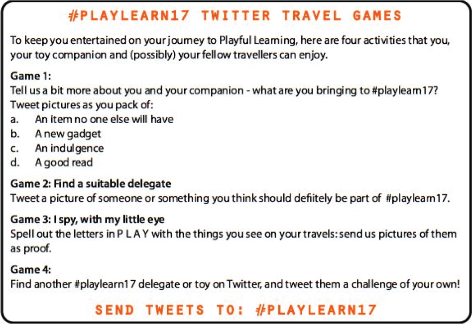 Two weeks prior to the conference, all delegates were sent instructions via email to bring a toy and to register that toy on Twitter in advance of the conference. The toys were encouraged to start tweeting at this point, with the first toy accounts appearing and engaging with each other the week before the conference started. A week before the conference, they were asked to complete a toy top trump card and they were sent Twitter travel games (Figure 1) to play on their journey. The pre-conference Twitter interactions were already encouraging playful interactions where 217 Toy tweets were sent in the 4 days prior to the conference starting compared to 61 from people.