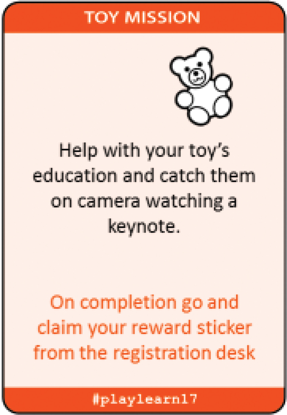 When delegates registered at the conference, they also registered their toy which received its own delegate pack including toy mission cards (Figure 2). The mission cards were based around the game Sneaky Cards, a pay-it-forward game encouraging positive and daring behaviour. The mission cards became a trading game for the conference and encouraged more Twitter conversations, as well as face-to-face interactions between the delegates themselves, and the delegates and organisers. Every time a mission was completed, toys received either a special sticker and a new mission or switched cards with another player.