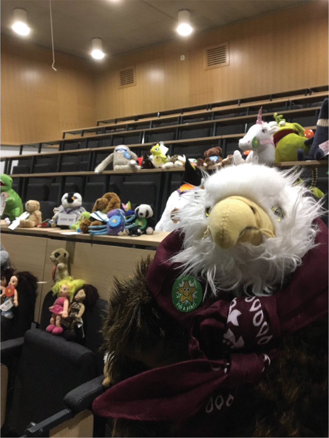 Organisers managed numerous alter ego accounts including other toys, toy keynote speakers, and, as had proved popular at previous conferences, an evil Twitter presence. These were used to help feed a puzzle for delegates to solve as to the identity of the kidnapper of the esteemed keynote Professor Prod Eagle. A toy keynote, a TED talk, was staged with restrictions on only toys attending and a riddle for where they should sit (Figure 3).