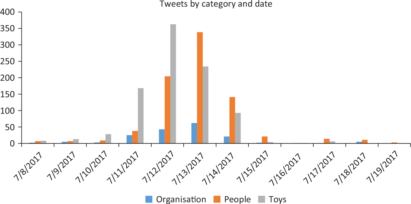 Figure 5. Numbers of individuals and tweets by category, 8 July 2017–19 July 2017.