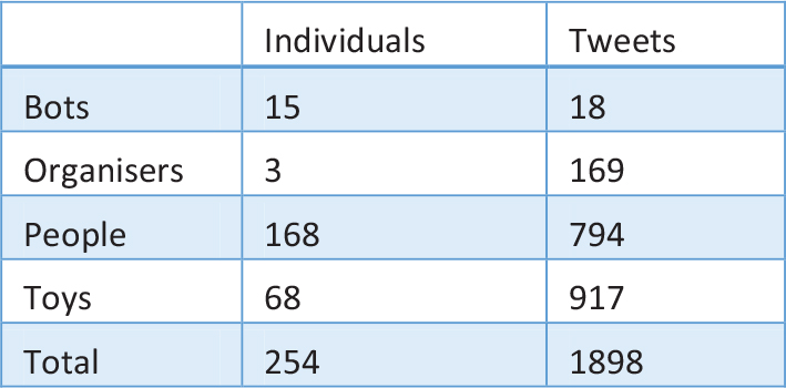 Of the top 10 who tweeted, aside from the organisers, 8 of them were toys and only 2 of them were people. The individuals who appeared in the top 10 were extremely active with 200 tweets but there were 388 from 8 different toys.
