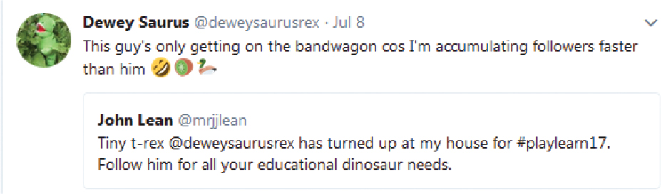 Many Twitter users in academia blur the boundaries between personal and professional usage, in some cases to the point where it’s hard to tell in what capacity they are tweeting (Bowman 2015). However, if one is using Twitter as a professional and connecting with others in this sphere, it means there is usually some balance needed between revealing too much or too little personal information or deciding how far to engage in certain discussions. In the words of Marwick and Boyd (2010, p. 124), ‘the tension between revealing and concealing usually errs on the side of concealing on Twitter’. One unforeseen consequence of the PL Twittersphere game was the way in which the use of alter egos allowed individuals the opportunity to break free from such constraints as the audience of the toy’s account was complicit in the game creating new opportunities for the individual as well as the wider PL CoP.