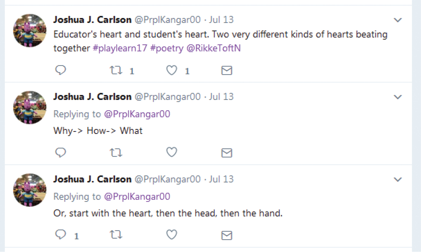 A positive dialogue that the conference wanted to exploit with its use of Toy Twitter was that of the community of practice (CoP) that is building around PL. A CoP can be a comforting place to be, peopled with like-minded souls and familiar territory. However, as Wenger et al. (2002, online) state, they also need ‘interesting and varied events’ in order to keep the ideas flowing and to bring new people into the community. Social media platforms are a valuable tool which ‘function as knowledge sharing arenas for a community of practice’ (Aramo-Immonen et al. 2016, p. 586). Using Twitter more strategically pre-, during and post-conference meant that the organisers could help to foster several of the seven principles of Wenger et al. (2002) for cultivating CoPs, in particular: