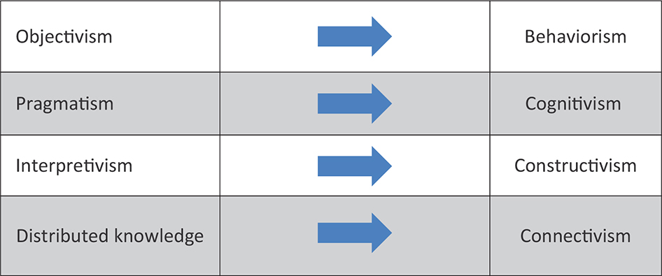 Drawing from the work of Driscoll (Siemens 2008b), learning can be categorised into three broad epistemological frameworks: objectivism, pragmatism and interpretivism. Objectivism emphasises that reality is external to mind and knowledge is acquired experientially, while pragmatism suggests that knowledge is a negotiation between inquiry and action. Interpretivism considers knowledge as an internal construction and is informed through socialisation and cultural cues. A fourth framework was introduced by Downes (2006) and supported by Siemens (2008a, 2008b). It says ‘… the view of knowledge as composed of connections and networked entities …The concept of emergent, connected, and adaptive knowledge provides the epistemological framework for connectivism as a learning theory’ (p. 10). Combining the two, the alignment between epistemologies and learning theories is detailed in Figure 1.