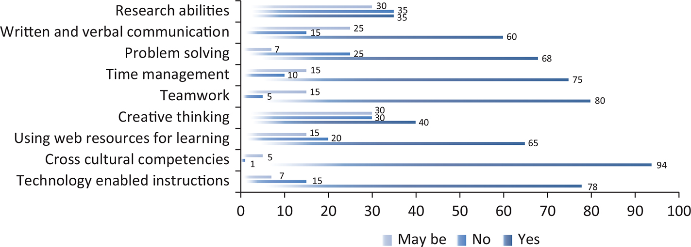 The activity was designed to develop cultural competency in the intercultural business management class and the scores came out to be highly satisfactory on this parameter. The skills related to organising and managing learning for using Web resource and technology-enabled instruction were rated between good and very good.Scores were relatively low on the critical thinking and research abilities. In the personal conversation, many groups blamed time as a constraint. It was interesting to see that the scores were very good for team work, time management and problem-solving. The abilities in verbal and written communication also scored averaged to good.